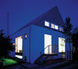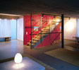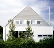 Dem fast vollständig verglasten Raumgefüge ist zur Gartenseite auf ganzer Länge eine Loggia vorgelagert, von der eine Treppe direkt in den Garten führt. Das Obergeschoss dient ausschließlich dem Leben und Wohnen der Kinder. Ein großzügiger Spielflur erschließt die Kinderzimmer mit eigenem Badezimmer. Die dem Wohnhaus auferlegte Formenstrenge und puristische Anmutung ist geprägt von der Haltung auf alles Nebensächliche zu verzichten und nur das Wesentliche zum Gegenstand der Gestaltung zu machen. Die wenigen eingesetzten Materialien: Putz für Wände, Beton für Decken und Fußböden, Aluminium für Dachhaut und Fensterkonstruktionen, Glas - transparent und mattiert - konsequent im Inneren wie im Äußeren eingesetzt, unterstützen diesen Gedanken.